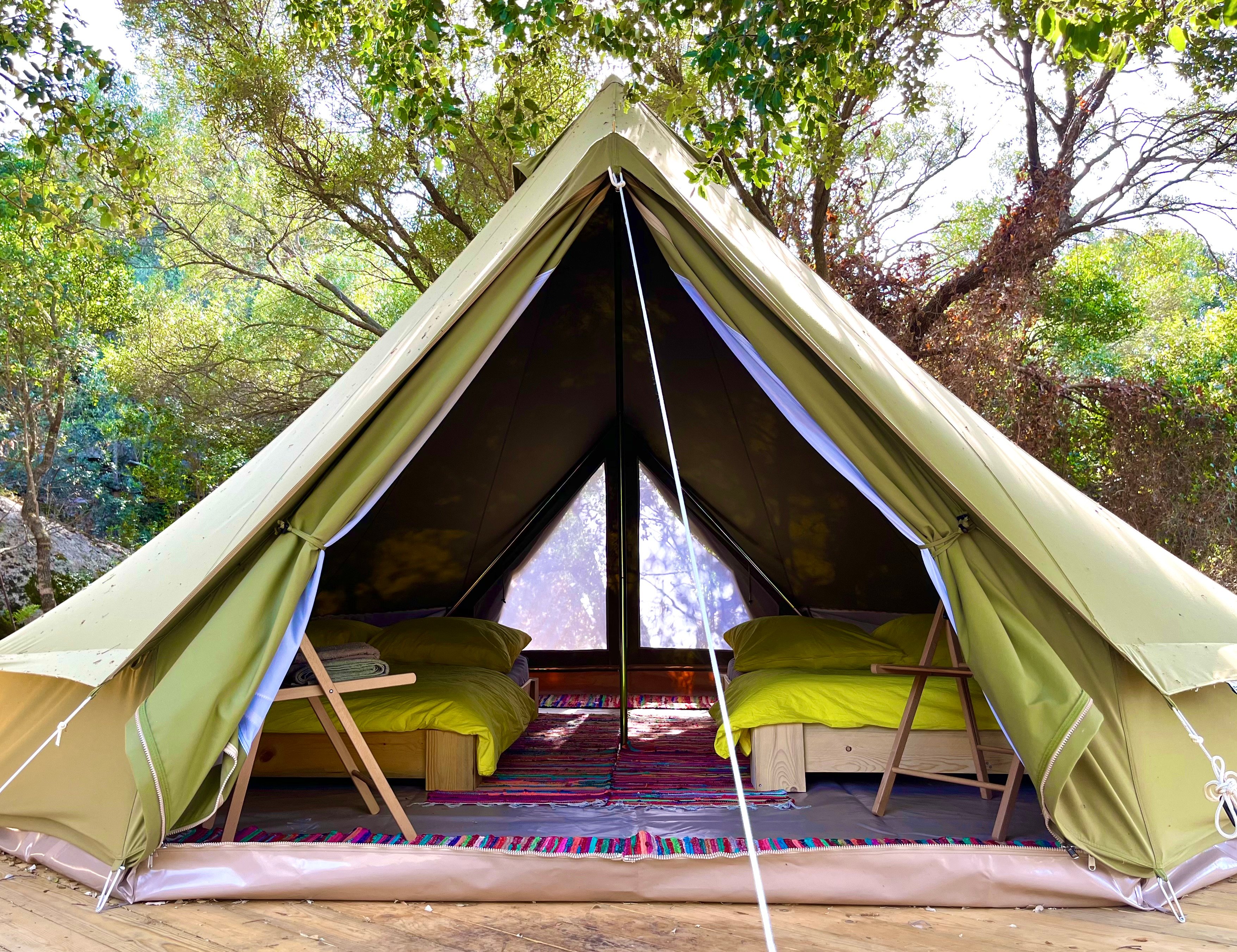 Ihr schlaft in einem unserer gemütlichen Glamping-Zelte in zwei Betten (140 x 200 cm; inkl. Bettwäsche und einem